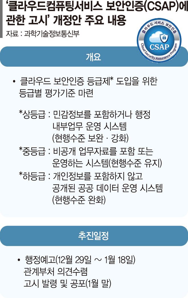 5일 정부 및 업계에 따르면 과학기술정보통신부는 이달 중 클라우드 보안인증 등급제(상·중·하) 도입을 위한 '클라우드 서비스 보안인증(CSAP)에 관한 고시' 개정안을 공포한다. 개정안의 핵심은 CSAP 체계를 △민감 정보를 포함하거나 행정 내부업무 운영 시스템(상등급) △비공개 업무자료를 포함 또는 운영하는 시스템(중등급) △개인정보를 포함하지 않고 공개된 공공 데이터를 운영하는 시스템(하등급)으로 나누는 것이다.