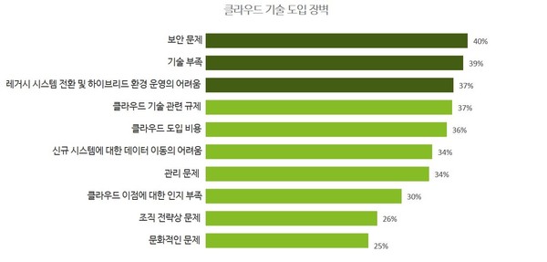 국내의 경우는 49%로 아태지역 평균을 상회한 수치를 보였다. 클라우드 기술 도입을 방해하는 문제에 대해서는 보안(40%), 기술 부족(39%), 레거시 시스템에서의 전환과 하이브리드 운영 환경의 어려움(37%) 등이 핵심 동인으로 꼽혔다.