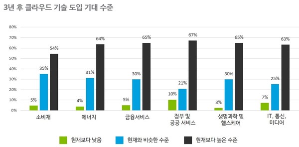 보고서에 따르면, 코로나19 이후 빠르게 변화하는 시장상황에서 각 산업별 변화가 요구되면서 클라우드는 기업의 생존과 번영에 필수적인 기술로 받아들여지고 있었다. 특히, 설문조사 대상자 62%는 클라우드 기술 도입 수준이 앞으로 3년 후에 더 높아질 것이라고 답했다.